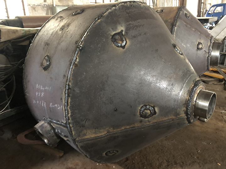 目前幹燥機械行業製造雙錐回轉幹燥機(jī)時普遍使(shǐ)用夾套加熱裝(zhuāng)置。但是其具有受熱不均勻的缺點,加熱介質難以進入部分夾套死角(jiǎo)區域(yù),影響產品質量(liàng)和產量。加熱介質容易在夾套內結垢。加熱介(jiè)質會因重力問題產生加熱(rè)偏向並引起熱利用率低的問題。另外夾套加熱裝置(zhì)屬於壓力容器(qì),對(duì)使用場(chǎng)所(suǒ)和(hé)後(hòu)期維護會有所限製(zhì)。夾套加熱裝置由鐵板(bǎn)與不鏽鋼板焊接而成,材料膨脹係數不同,長時間使用有容易滲(shèn)漏的缺點。