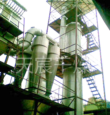 潔淨空氣加熱後進入幹燥塔,在塔內熱風中用二流體(或三流體)噴嘴將各種料液物化成微小液滴,與熱風進行快速熱交換,蒸發掉液料中的水份(或溶劑),並隨熱風排(pái)出,得到粉狀產品。