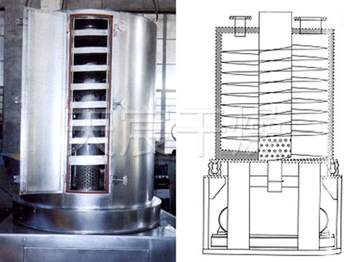 產品概述:濕物料(liào)自頂部(bù)加料口進入(rù)螺旋床內,在周向激振力及重力的作用下(xià),物料沿螺旋床自上而下作跳躍運動直至底層;同時,潔淨的熱風由螺旋床底(dǐ)部進入,與(yǔ)分布在(zài)床上的物料進行充分的傳熱和傳質後,由頂部排濕口排出。從而使物料達到了幹燥的(de)目的(de)。